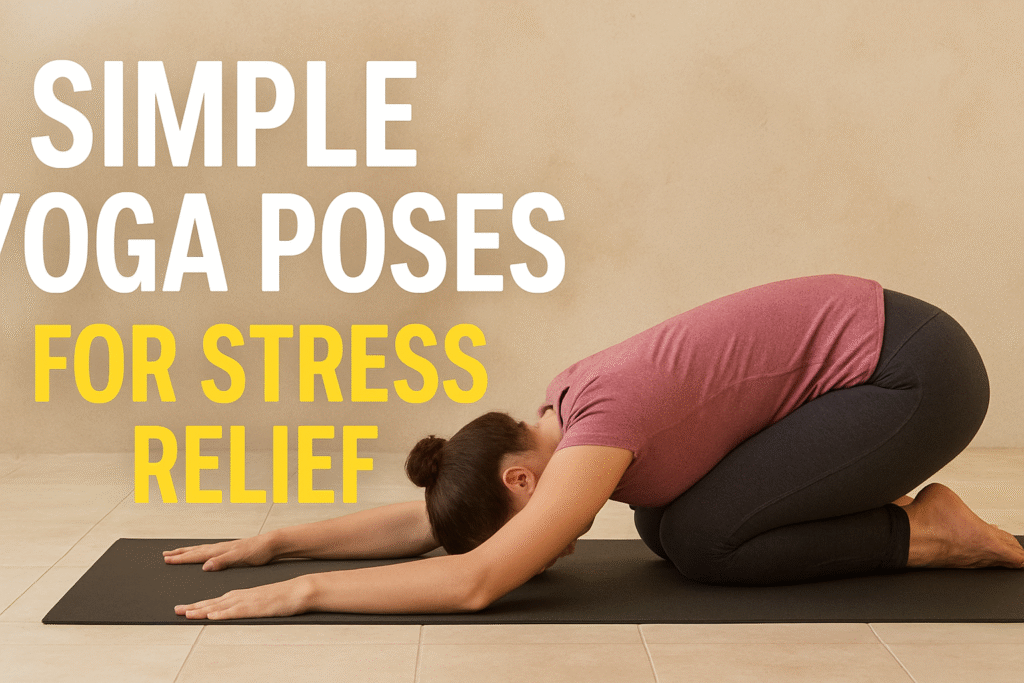 Child’s Pose (Balasana) and Corpse Pose (Savasana) are the simplest and most effective yoga poses for stress relief at home. They calm the mind, slow down breathing, and relax the body.